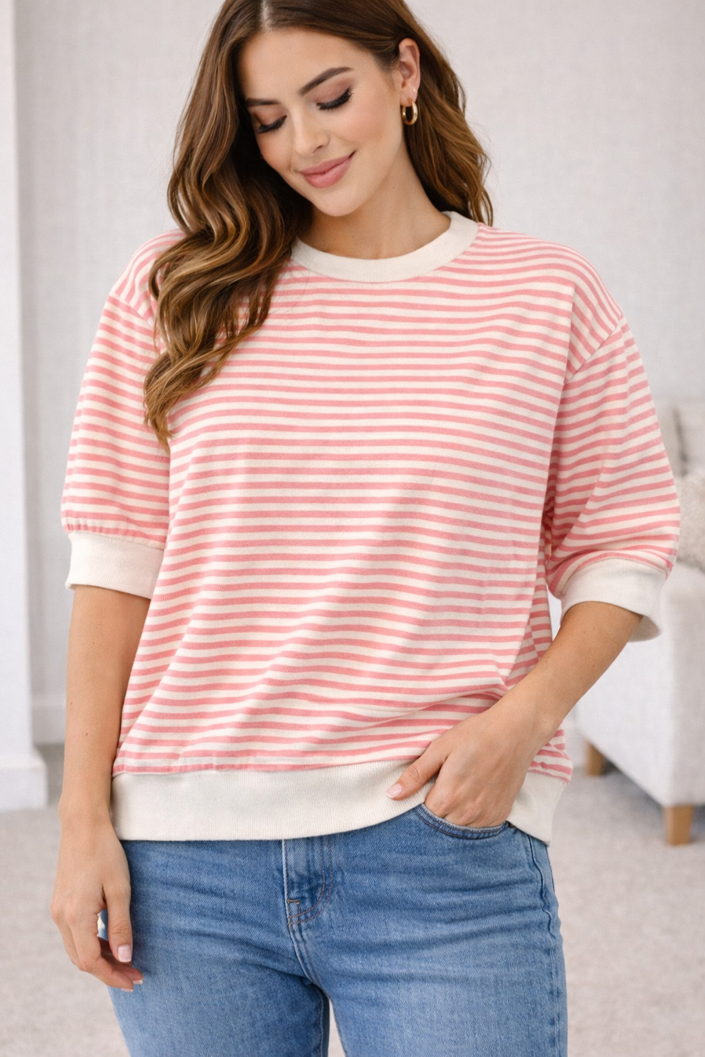Effortlessly versatile, this slouchy crewneck combines soft pink and pale yellow stripes in a relaxed, oversized silhouette. The breathable cotton construction and short sleeves make it ideal for layering over basics or wearing solo during warmer months. A modern staple that transitions seamlessly from casual weekends to laid-back weekday styling, this piece delivers comfort without compromising on contemporary appeal.