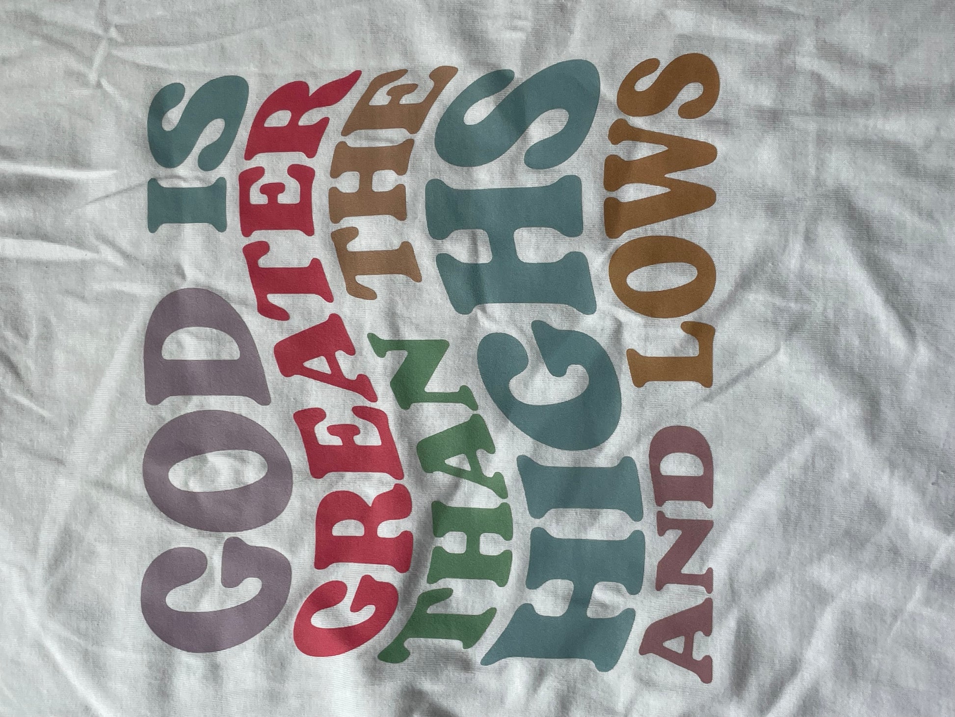 Expertly crafted from 100% cotton, the God is Greater Tee showcases a pastel color palette that adds a fun touch to your wardrobe. Featuring the empowering message "God is greater than every high and every low," this tee is a reminder of the comfort and strength that faith brings.