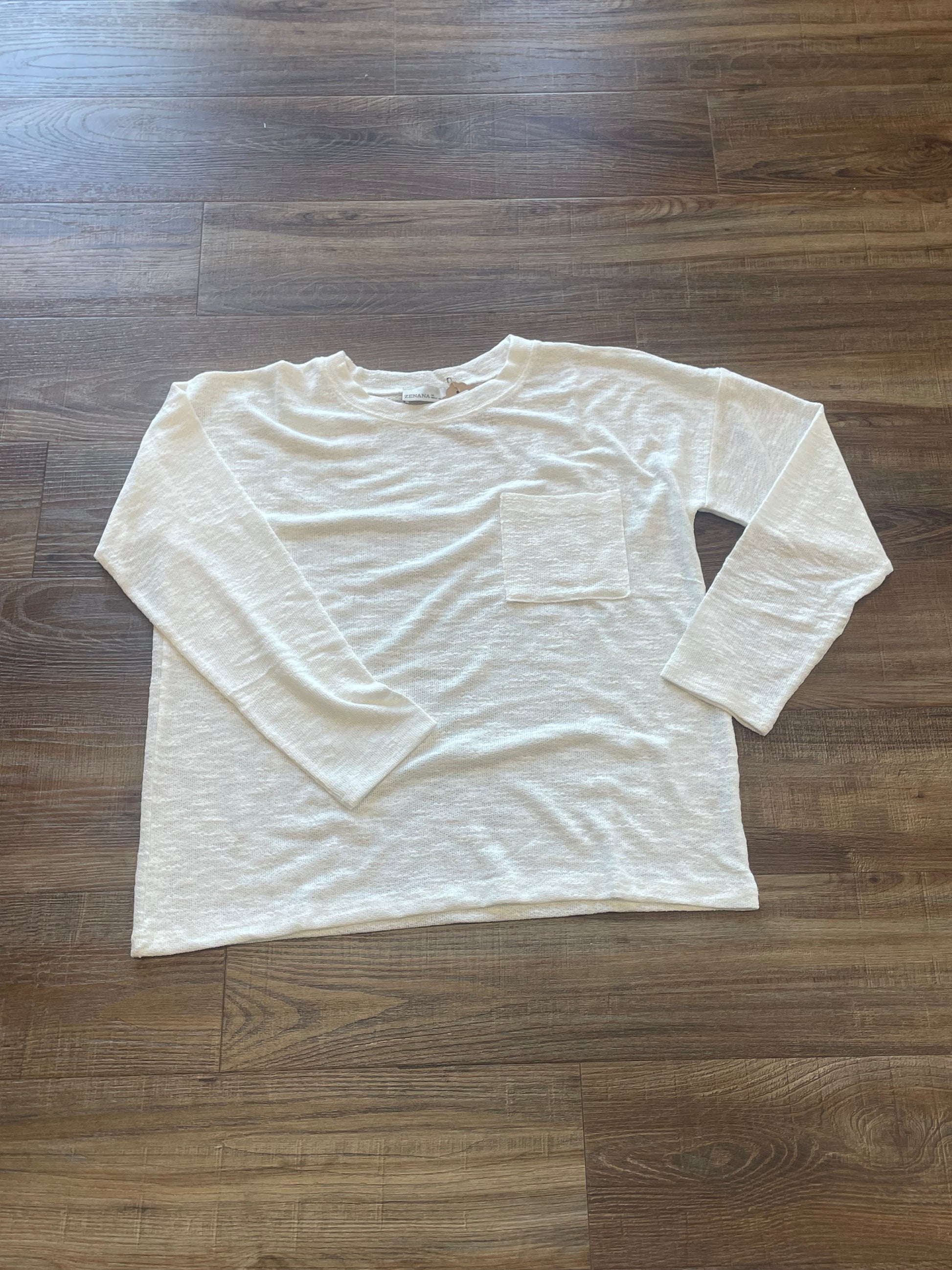 Crafted from a soft blend of 63% polyester, 33% rayon, and 4% spandex, the Ivory Haven long sleeve shirt offers exceptional comfort and a gentle stretch for ease of movement. Its hacci knit provides a subtle textured feel, while the elegant ivory color ensures versatile styling, making it an ideal choice for layering or wearing on its own throughout the seasons.