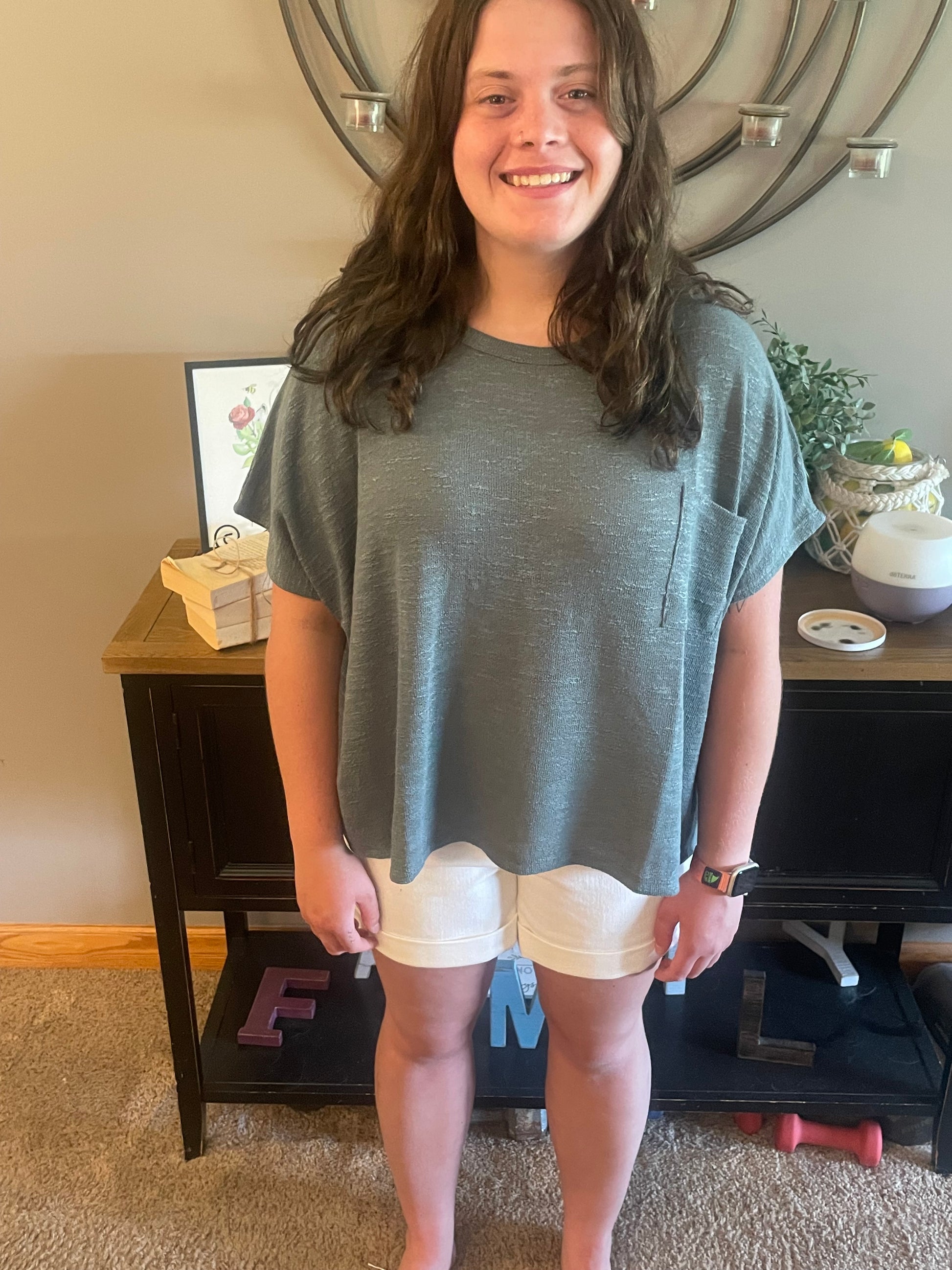 Introducing the Jaded Tee, a stylish and comfortable top that combines the softness of slub hacci fabric with an oversized fit and a convenient pocket. Made with a blend of polyester, rayon, and spandex, this ash jade colored tee is perfect for pairing with your favorite Judy Blue jeans or shorts. Upgrade your wardrobe with this must-have addition.