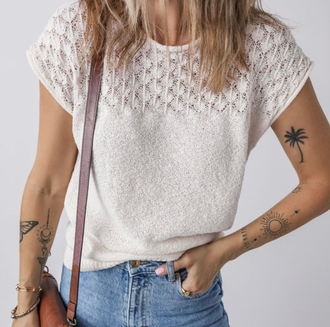 Purity: A versatile choice, this white eyelet top features 100% viscose for lightweight comfort. The textured fabric adds dimension, while the tie back and round neck offer a customizable fit. Perfect for dressing up or keeping casual.