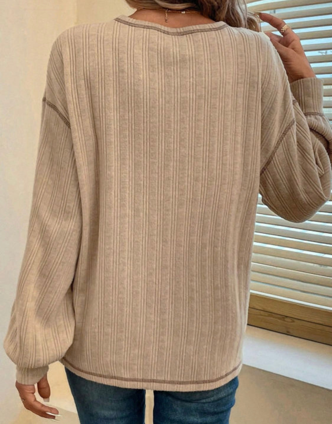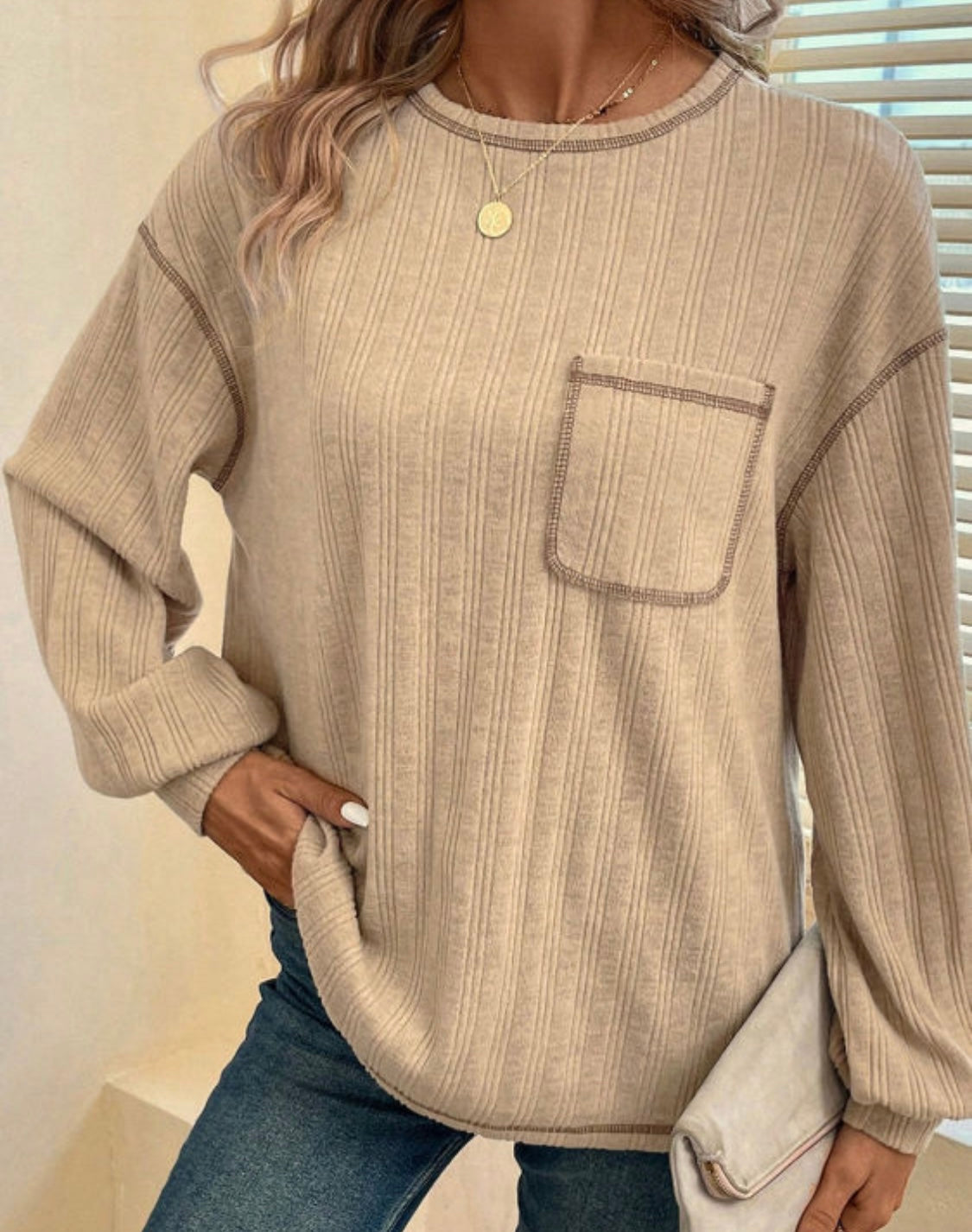 Indulge in comfort and style with Savannah Chic's pale khaki long sleeve. The exposed stitching and pocket add a touch of unique detail, while the super soft fabric of 97% poly and 3% elastane ensures a cozy fit. Elevate your wardrobe with this must-have piece.