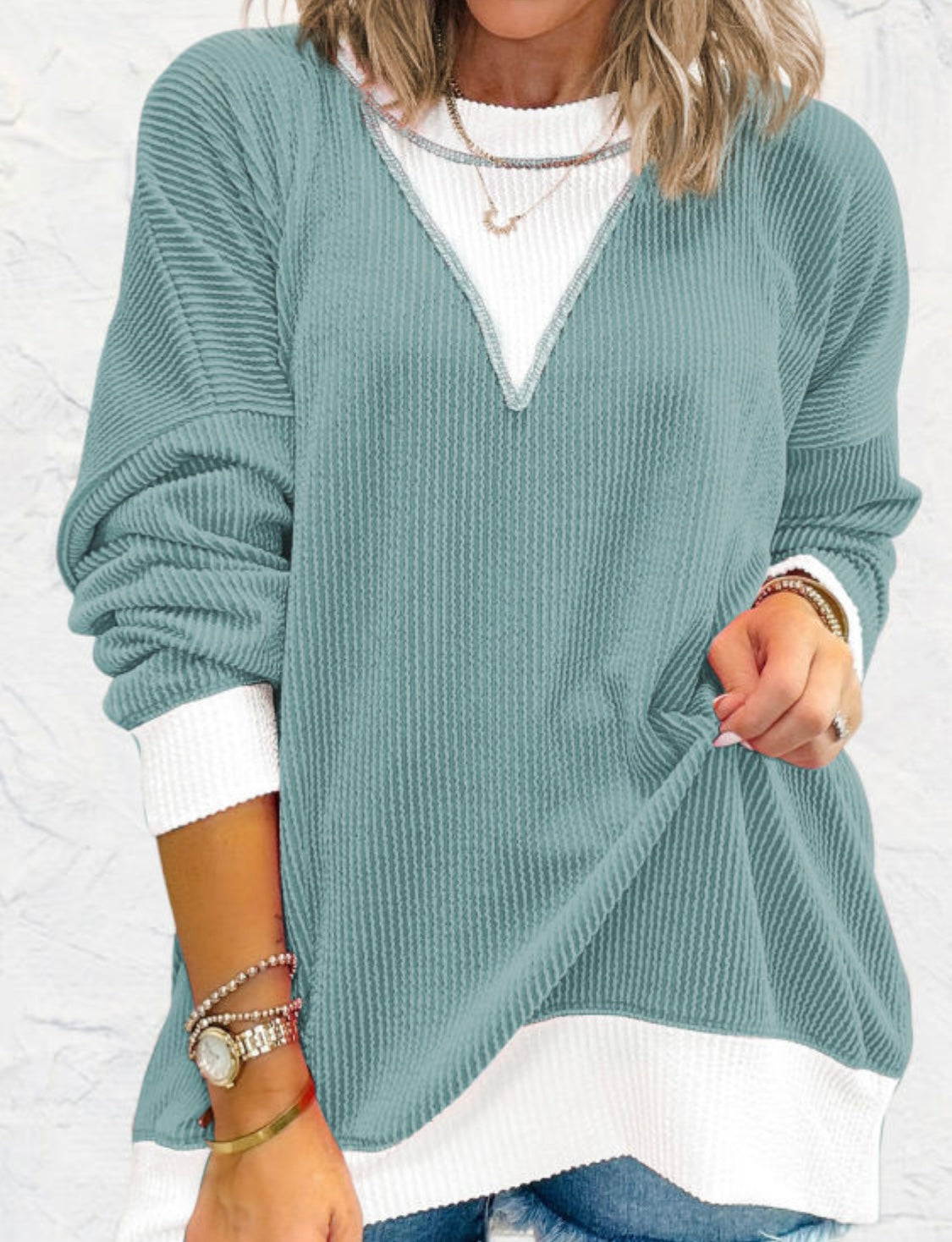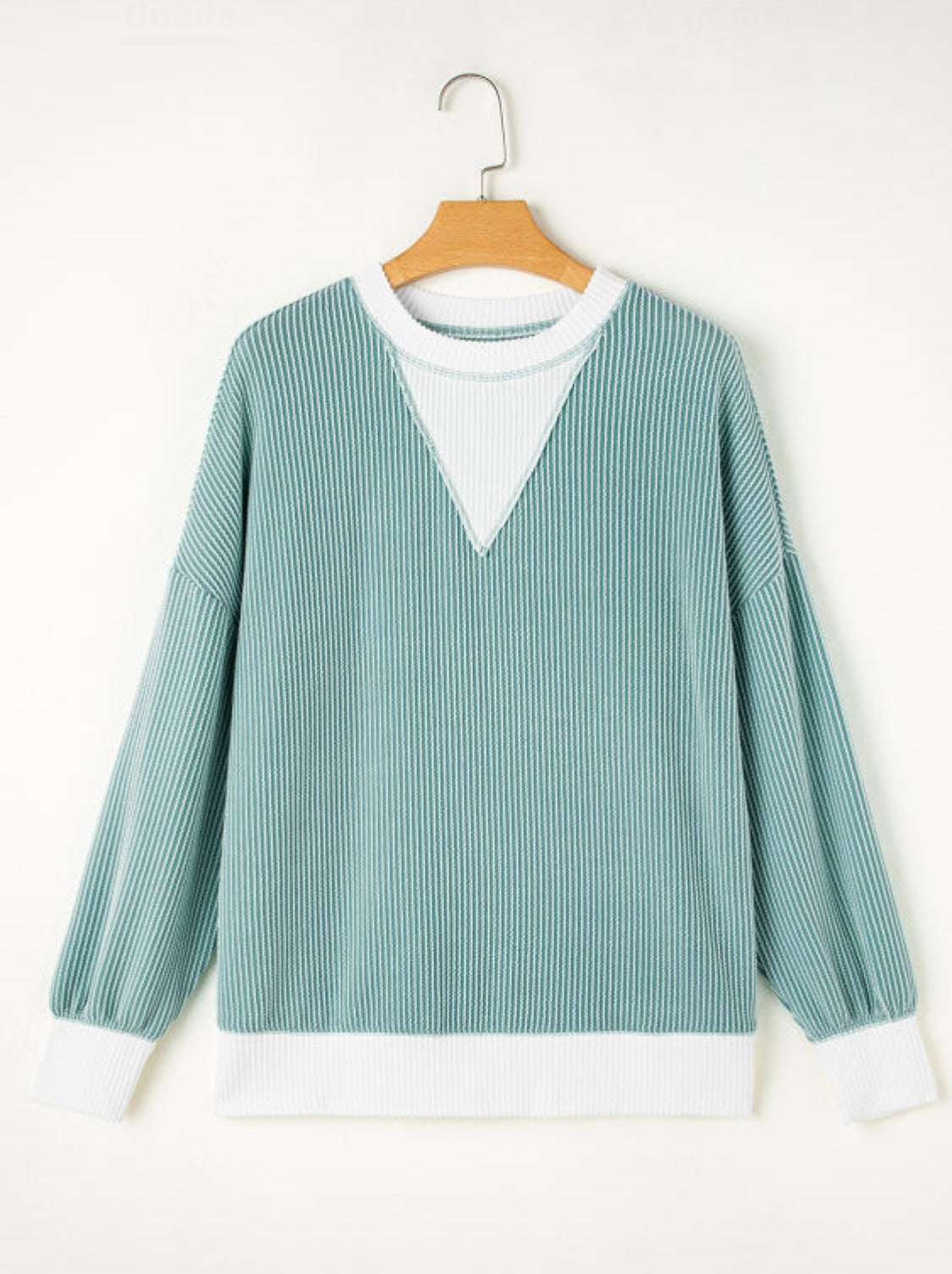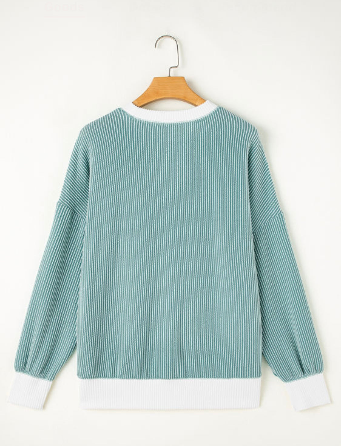 Stay comfortable and stylish with Skye Corded. This light blue, long sleeve top features white contrast drop shoulders and a loose fit for a cozy feel. Made with a blend of 75% polyester, 20% viscose, and 5% elastane, it offers ultimate comfort and a flattering fit.