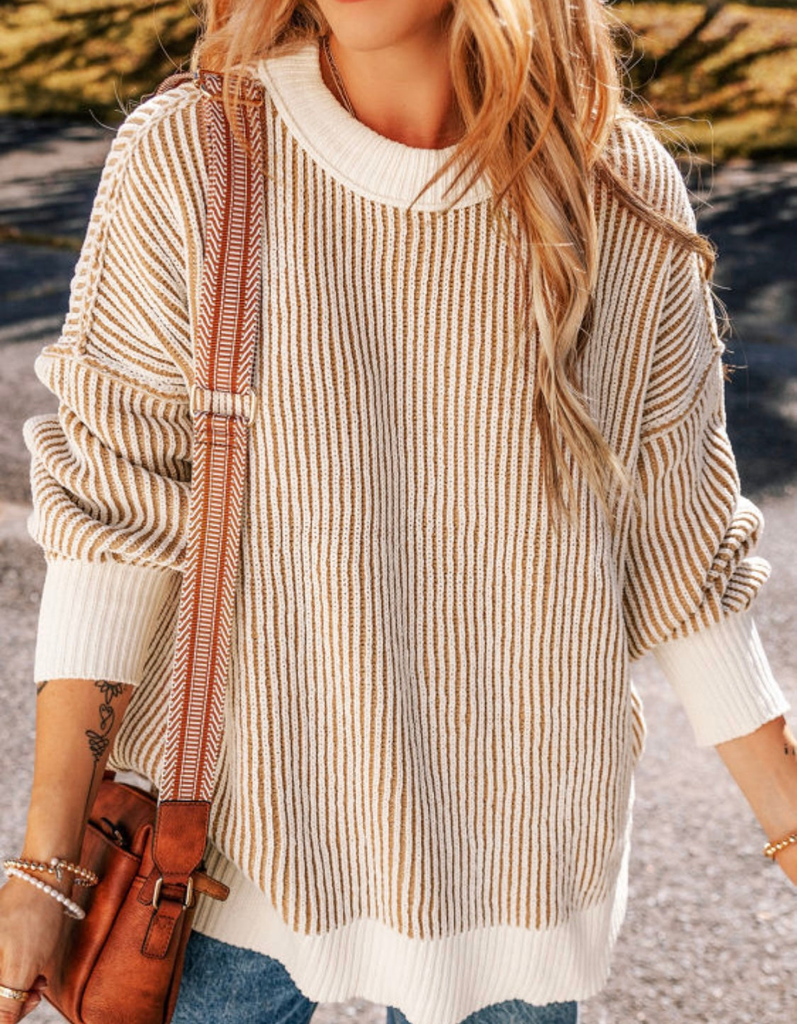 Sweet chestnut striped sweater textured knit contrast edge loose sweater super soft 100 polyester